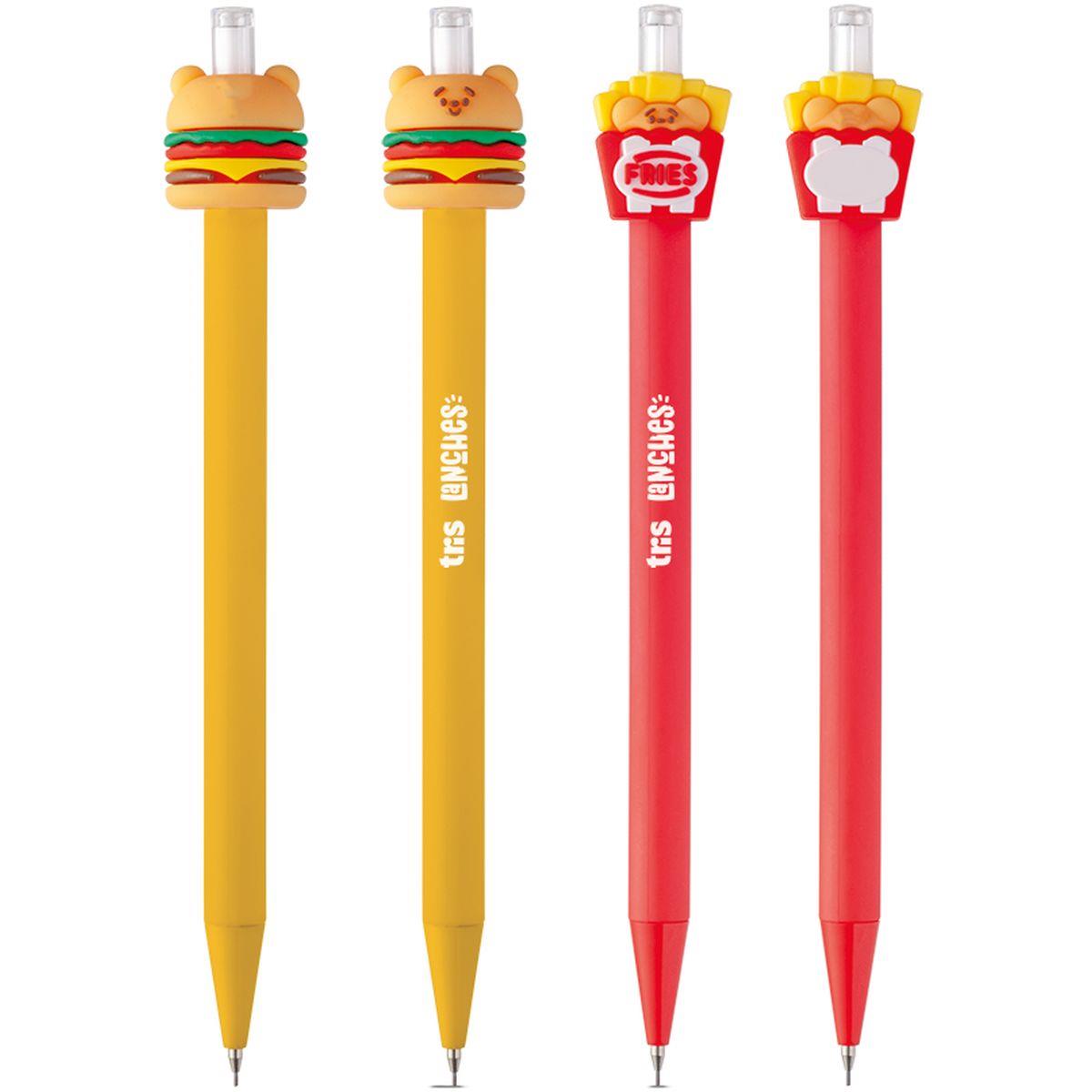 A lapiseira Lanches tem tematica dos lanches mais amados: hamburger e batata frita! Com toppers especiais, corpo emborrachado e confortavel e traco 0,7mm. Possui mecanismo retratil e borracha no topo!